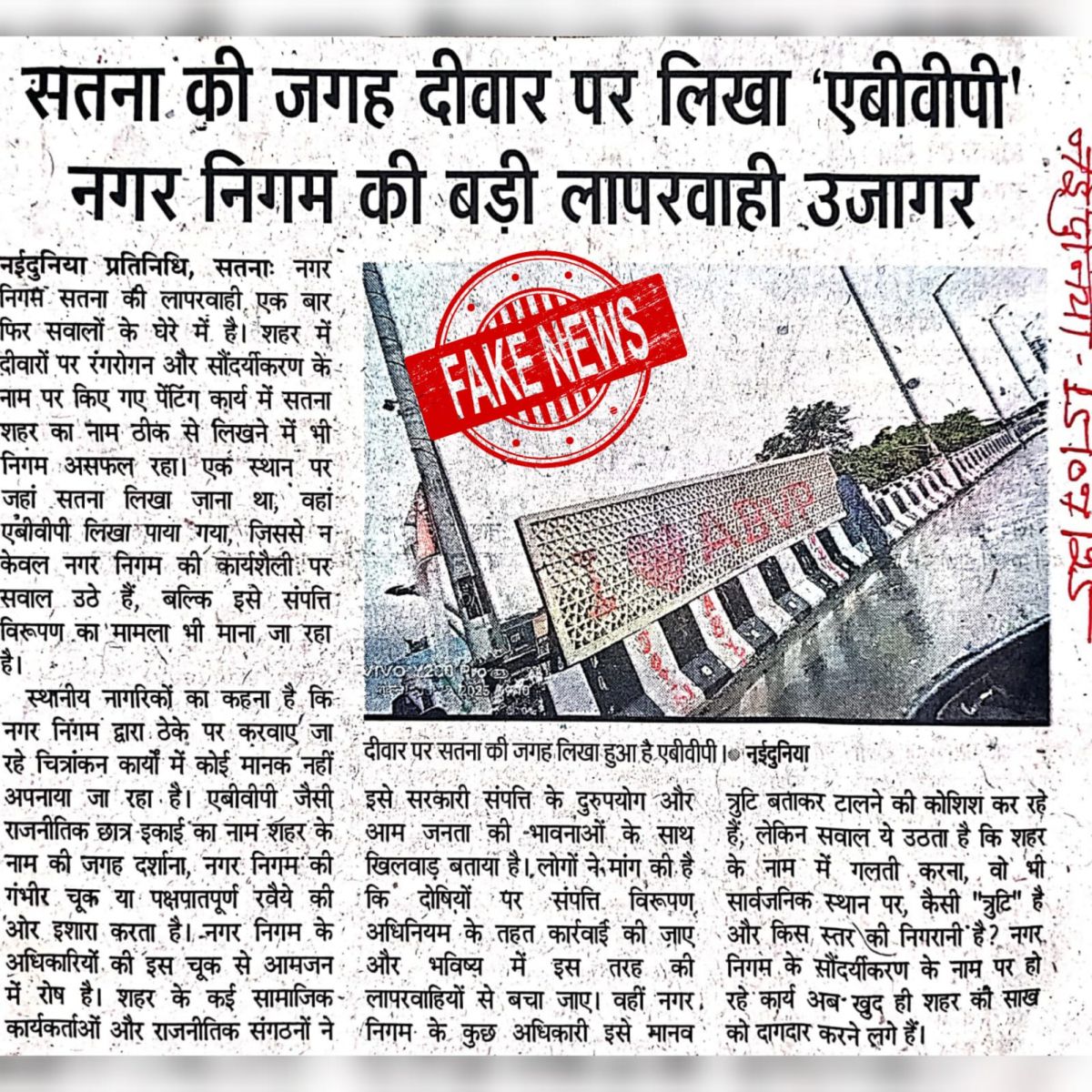 नईदुनिया दैनिक समाचार पत्र में दिनांक 15/07/2025 को प्रकाशित यह खबर पूर्णतः तथ्यहीन एवं भ्रामक है।